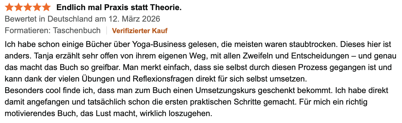 Dieses Buch basiert nicht auf Theorie. Es basiert auf Praxis. Egal, ob du gerade am Anfang stehst oder dein bestehendes Yoga-Business endlich klarer, stabiler und skalierbarer aufstellen möchtest – du profitierst von echten Erfahrungen, ehrlichen Einblicken und einer klaren Struktur.